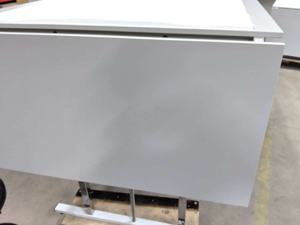 Tischplatte in 18mm mit Laminat und ABS-Kautschuk hellgraue Kante 2mm und MDF-Kern.