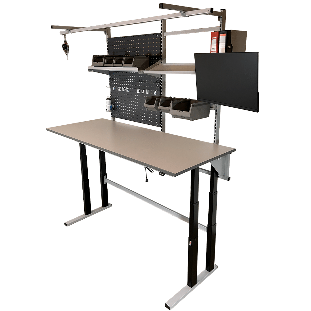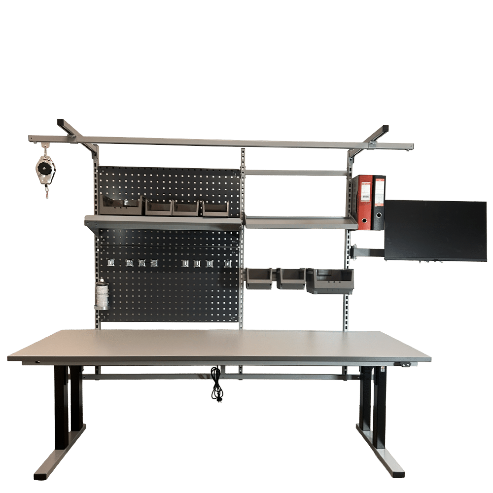 Denne model er udstyret med en komplet overbygning, som giver maksimal organisering over bordfladen med plads til ophæng, hylder og opbevaring. Samtidig leverer bordet høj stabilitet via 4 løftesøjler og en løftekapacitet på 400 kg, hvilket gør det velegnet som både arbejdsbord, montagebord og produktionsbord i krævende drift.