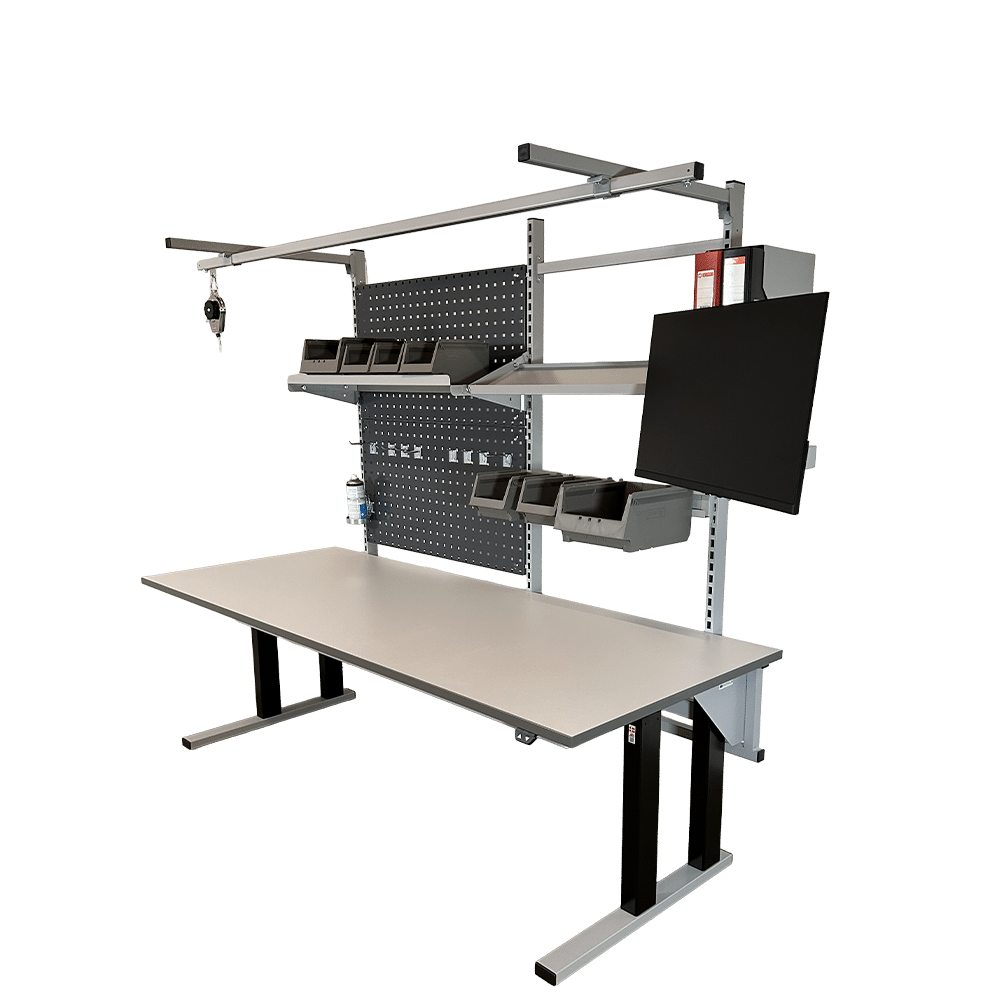 En overbygning giver mulighed for at organisere værktøj, materialer og udstyr over bordfladen, så arbejdsstationen bliver mere effektiv, standardiseret og nem at holde ryddelig.