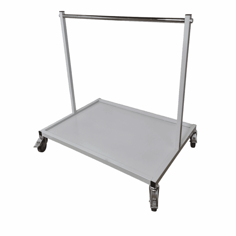Bøjlestativ til tromler – 1000x750x1065 mm. Robust konstruktion i pulverlakeret stål med TENTE-hjul Ø100. Vægt 25 kg og maksimal belastning 100 kg. Ideel til håndtering, opbevaring og af-/pårulning af plastiktromler, ruller og kabelspoler.