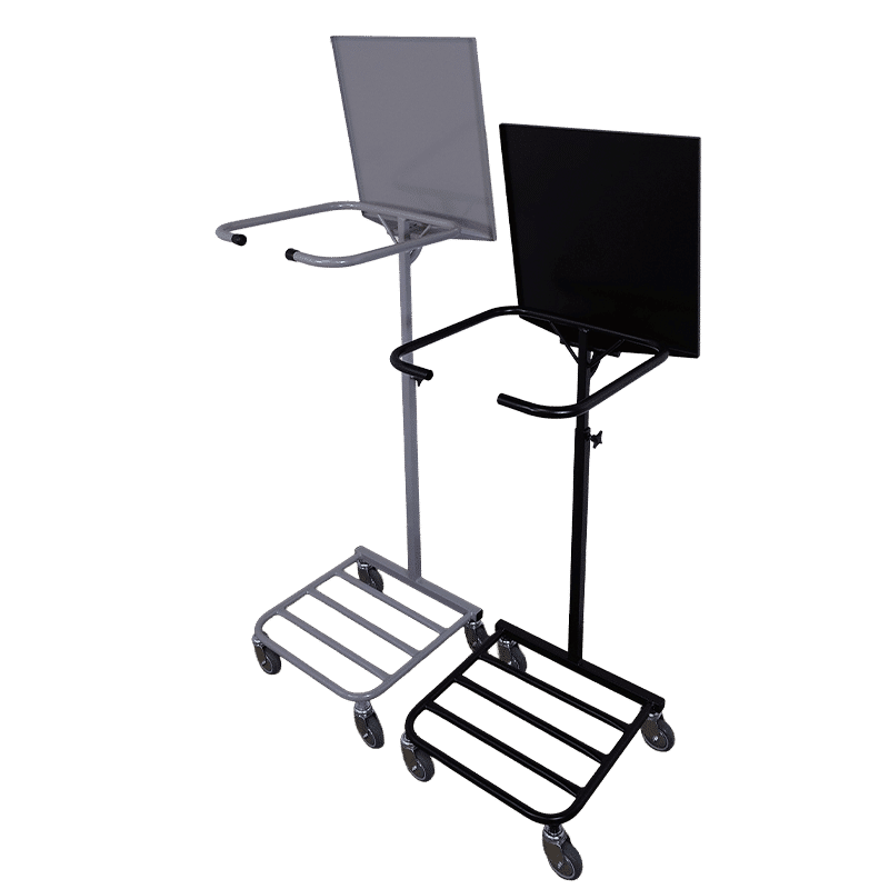 Stativet kombinerer låg, hjul Ø75 og kompakt konstruktion med mulighed for farvevalg og specialmål – så det passer præcist til dine behov og miljøet.