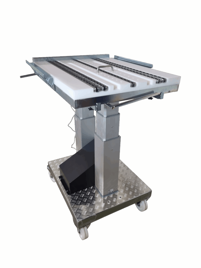 Værktøjsvogn med hæve sænk fremstillet i rustfrit stål med rulleskinner og plastik bordplade. Udviklet til krævende og hygiejnefølsomme miljøer, hvor præcision, rengøringsvenlighed og fleksibilitet er afgørende.